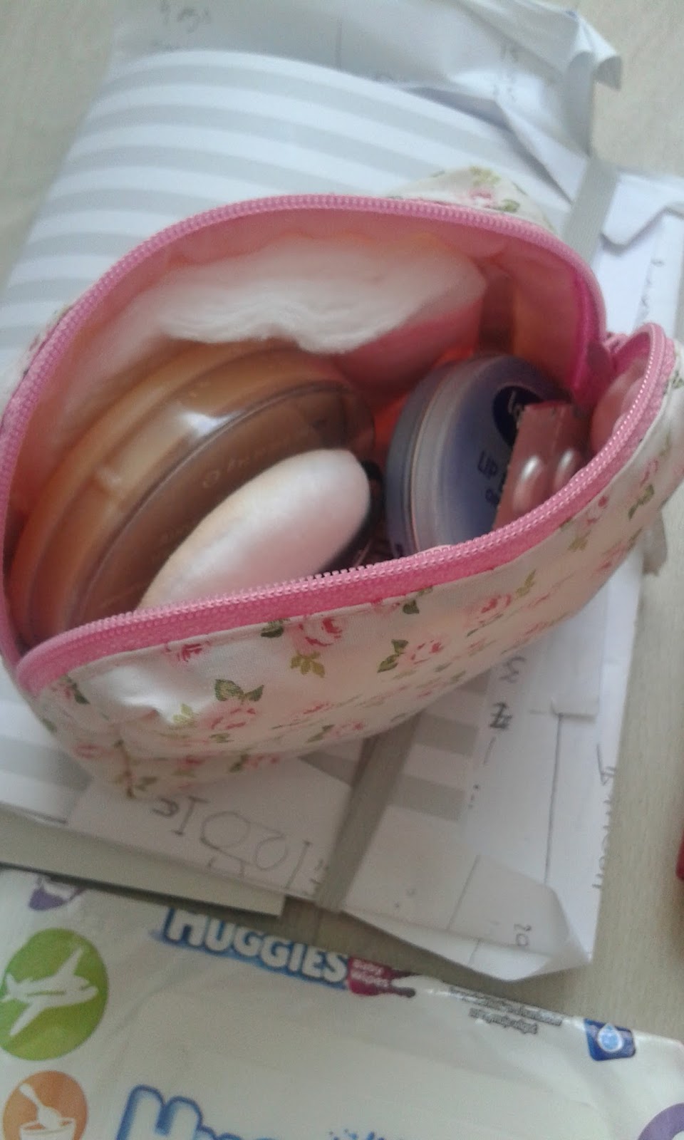 The last thing is just some babywipes and my super girly mini makeup bag. I bought this at H&M maybe 10 years ago and it is still my favorite specially becausr it is completely washable!